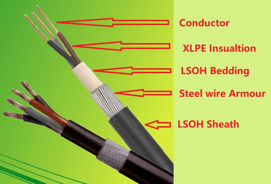 BS 6724 strömkabel består av en T1R kopparledare, XLPE-isolering, PVC-sängkläder, ståldämmare och LSOH-mantel.